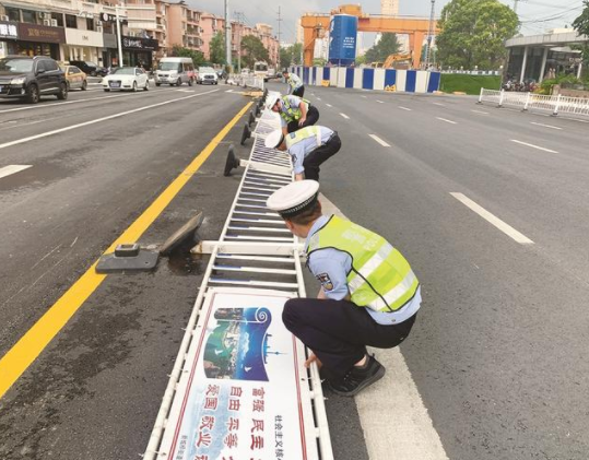 昨天下午3时许,市区天气突变、乌云密布、疾风骤起,市区工农路青年路路口的道路中心隔离护栏被齐刷刷吹倒在地。市交警二大队副中队长陈亮与同事们一道将护栏扶起,在极短时间内恢复了通行秩序。
