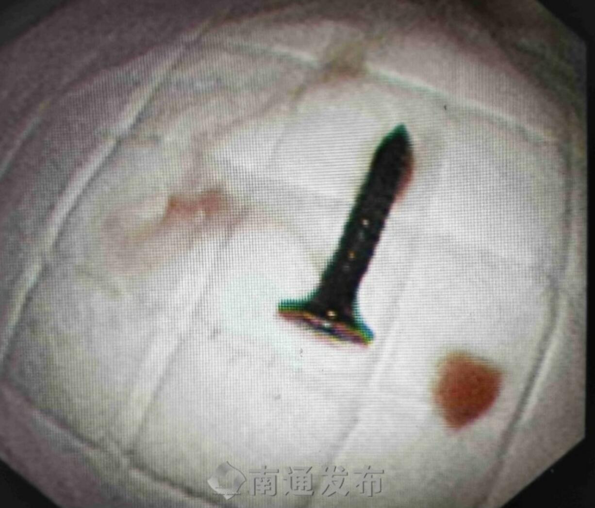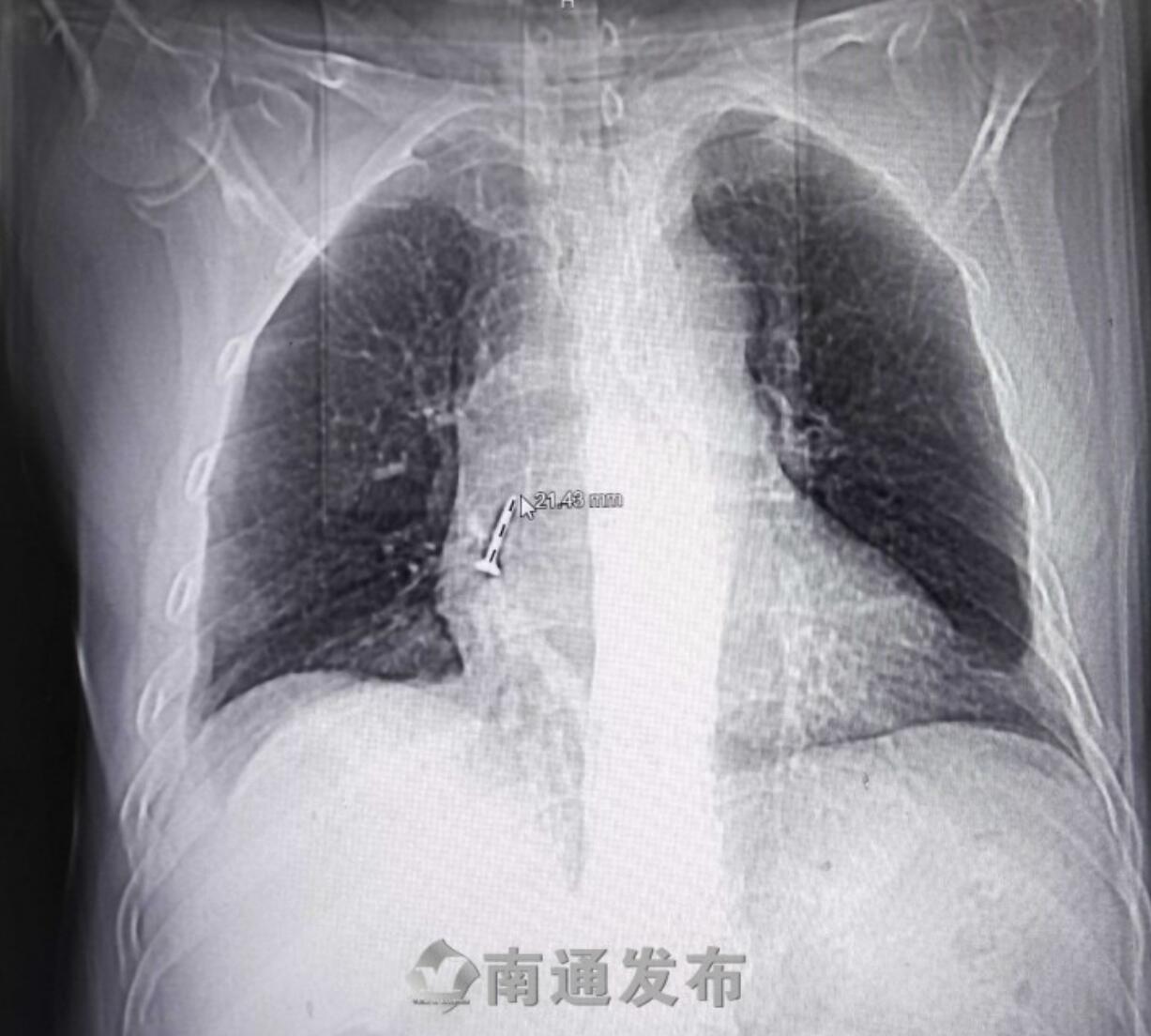 22日,吴大伯在儿子的陪同下来到南通市第六人民医院呼吸与危重症中心就诊。“从他带来的影像片上看有一个亮点,一看就是一颗螺丝钉,追问病史,原来这个患者是一个木工,但他自己也想不起来这颗螺丝钉是什么时候、怎么掉进去的,回忆可能是在抬头安装吊顶的时候,嘴巴刚好微微张开,螺丝钉不经意间落入气管。”南通六院呼吸与危重症中心专科副主任史广林告诉记者,因为螺丝钉的头子很尖锐,有可能损伤血管,所以为了明确螺丝钉在气管内的情况,又安排患者做了增强CT,评估病情。发现万幸的是,螺丝钉没有损伤到血管,相对安全,于是决定在局部浸润麻醉下经支气管镜为患者取出异物。