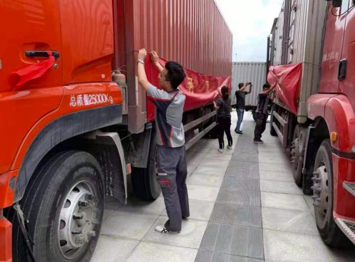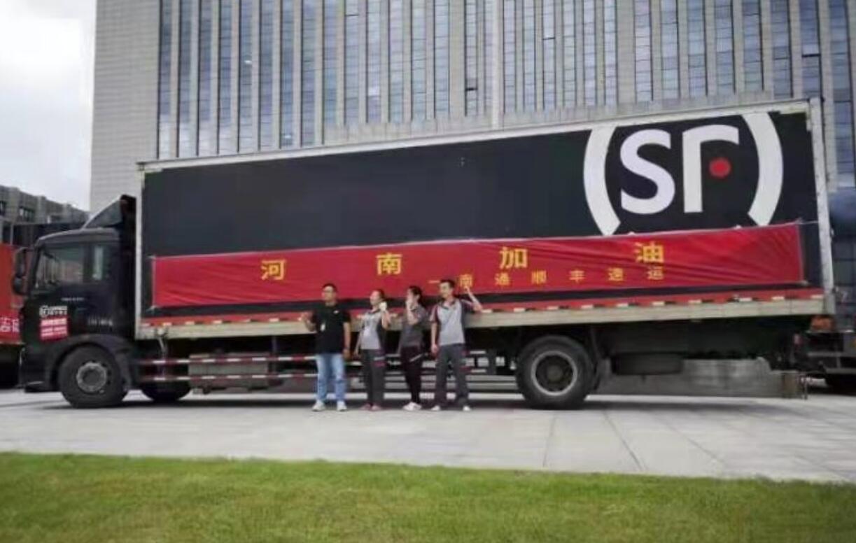 7月24日下午4点半,四辆周身挂有“河南加油”条幅的顺丰速运大货车跟随车队,从南通国际家纺产业园驶出,启程奔赴目的地河南新乡。