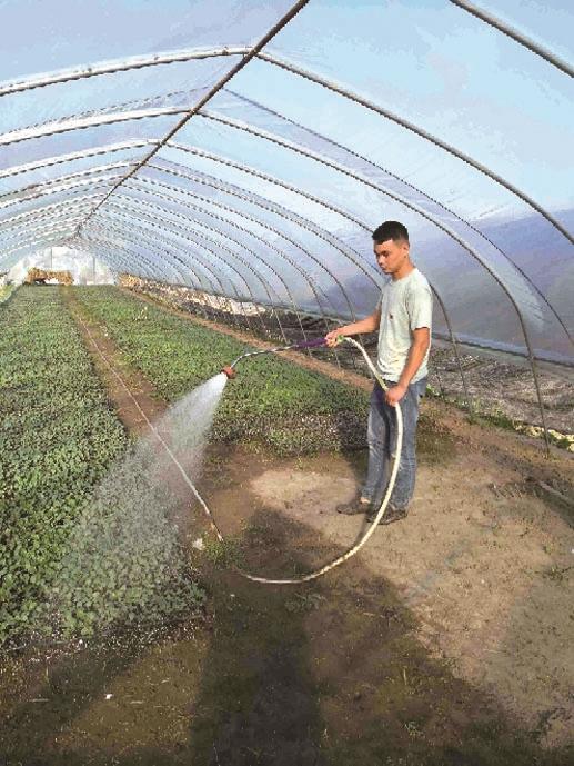 22日下午,在启东星生代家庭农场,吴昊正在大棚里给西兰花苗浇水,他告诉记者:“天气炎热,这些西兰花苗每天都要浇足水,8月1日就可以移栽进大田去了,两个大棚的苗可以种50亩。”