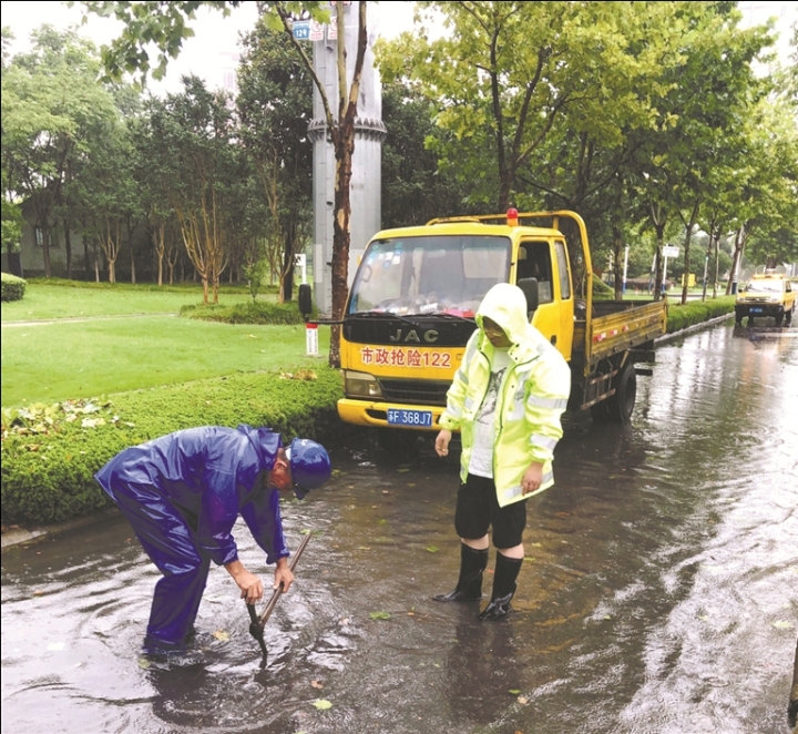 昨天上午,市园林绿化管理处绿化应急抢险队伍在市区城山路红星路交叉路口南侧路段处置两棵倒伏的法国梧桐。施工人员疏导行人,放置警示标志,对倒伏的树木进行修剪,用机械和人工相结合的方式扶正树木,对树木支撑重新加固。 记者尤炼