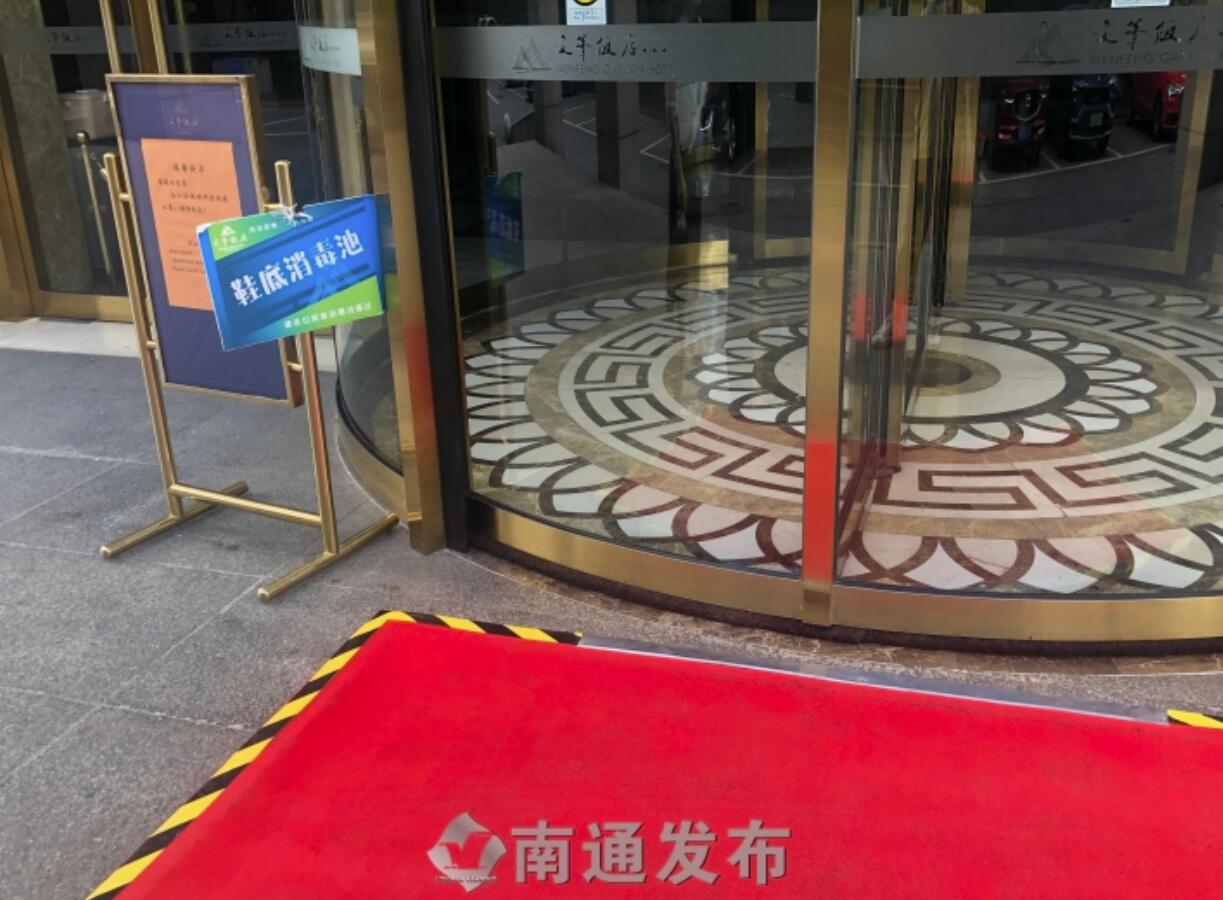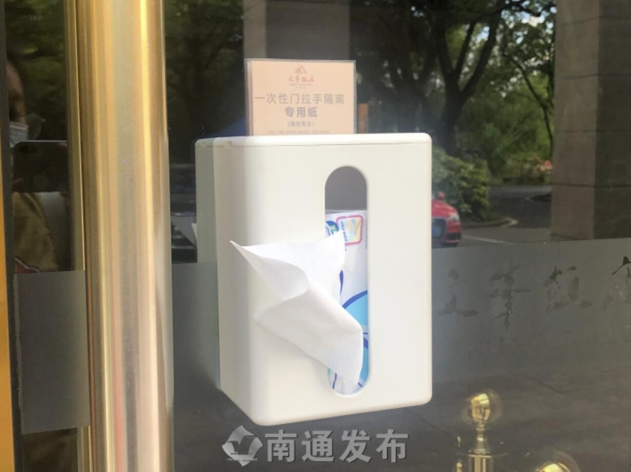 来到饭店主楼,入口处设有“鞋底消毒池”,写有“入内佩戴口罩”的温馨提示十分醒目;各电梯口内、外侧均配备隔离手纸,入电梯的客人可以不直接接触按钮。