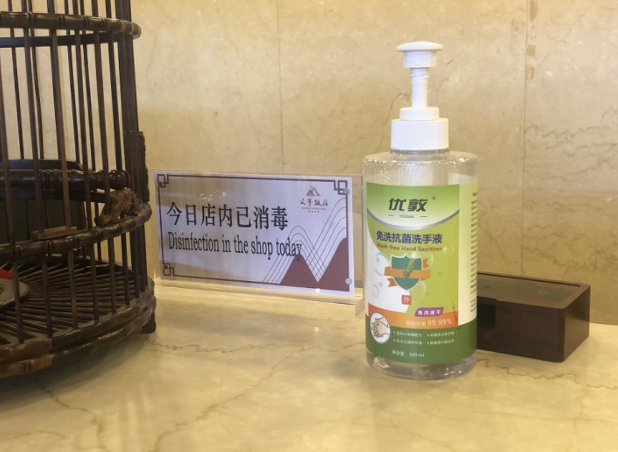 客房服务台上放有“今日店内已消毒”的标牌、免洗抗菌洗手液,工作人员佩戴口罩接待顾客。