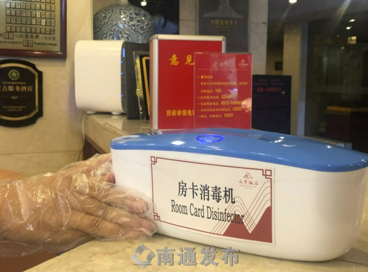“所有的房卡在客人退房回收后,全部用机器进行统一消毒。”工作人员拿出一台房卡消毒机器进行演示。