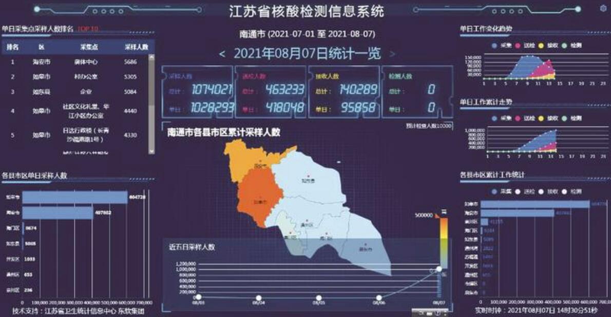 该系统还配备了一部可视电子大屏,市疫情防控指挥部可通过大屏实时看到全市各地的核酸采样进度,包括采样人数、送检人数、标本接受人数、单日采集点采样人数排名、各县(市、区)采样人数排名等数据。(记者冯启榕)