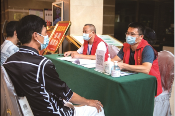 8月8日,在张家界青河锦江国际酒店大堂,翟勇彬(右一)协助登记滞留游客信息。自7月29日至8月7日24时,湖南省张家界市累计报告本土确诊病例37例。8月3日,张家界市宣布,即日起,境内的居民、游客等所有人员不得离开。驾车去张家界旅游的湖北游客翟勇彬因此滞留在张家界市武陵源区。翟勇彬想为当地疫情防控出一份力,自告奋勇当起了志愿者,与当地文旅部门工作人员一起活跃在疫情防控一线。 新华社记者陈思汗