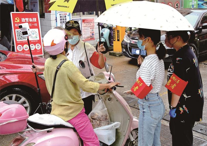 8月15日,崇川区和平桥街道北濠东村社区6个防疫卡口的党员、大学生志愿者们冒雨站岗,他们打着雨伞,给进入小区居民测量体温、查验“二码”。雨中严守疫情防控关口,保证疫情防控措施不变,力度不减。 李斌 范菁摄