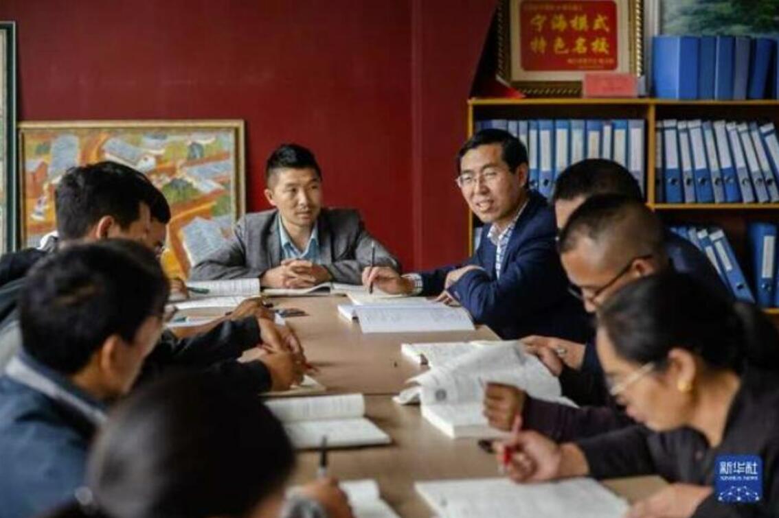 在宁蒗宁海民族中学,海安老师王拥军(右四)作为化学备课组组长和同事一起备课(8月26日摄)。新华社记者 胡超 摄
