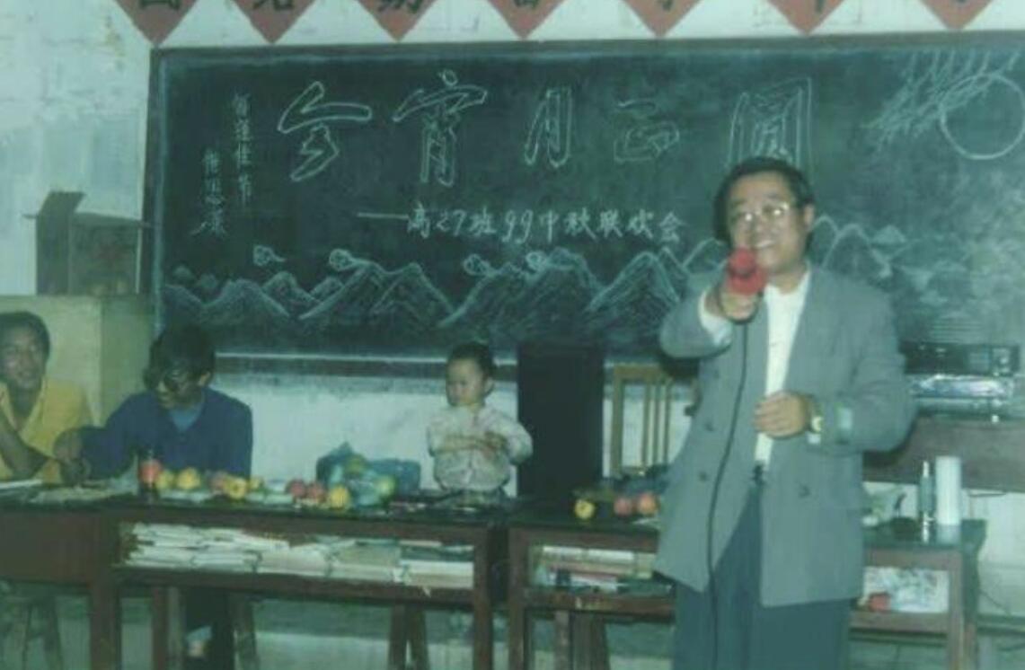 拼版照片,上图为:海安老师王霖伯在宁蒗宁海民族中学高27班教室过中秋节(资料照片,1999年9月摄);下图为:海安老师王霖伯在宁蒗二中高103教室上课(2021年4月23日摄,新华社发)新华社发