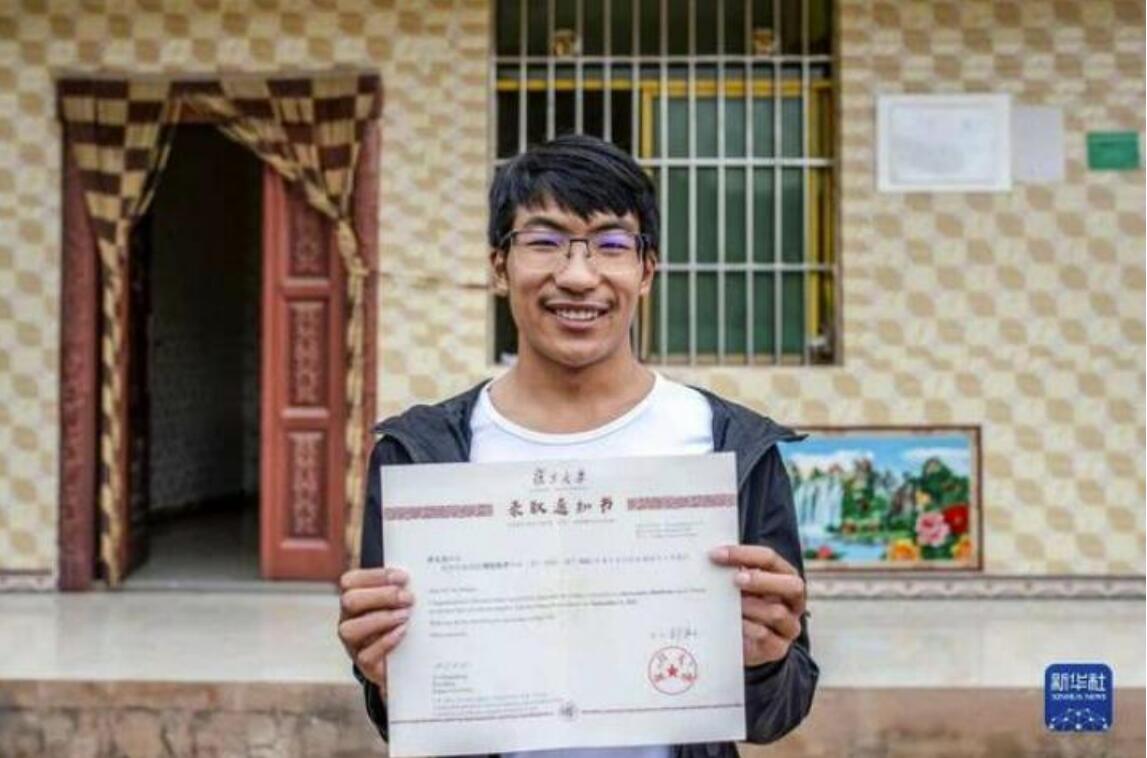 宁蒗宁海民族中学第三届“海安班”学生苏文杰展示不久前收到的复旦大学录取通知书(8月25日摄)。新华社记者 胡超 摄