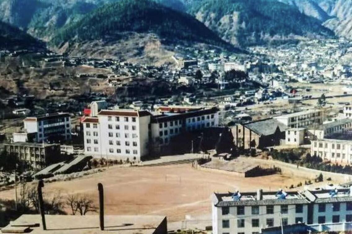 拼版照片,上图为:20世纪90年代的宁蒗宁海民族中学一景(资料照片);下图为:2021年4月16日拍摄的宁蒗宁海民族中学一景(无人机照片,新华社记者胡超摄)新华社发