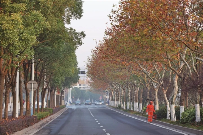 26日,在市区世纪大道和园林路交叉口向南路段,两侧香樟碧绿的叶子和梧桐树深浅不一的黄色相互辉映,让整条大道两侧颜色分明,呈现出一路走过犹如同时经过夏秋两季,“半秋半夏”独特的风景引人注目。 记者许丛军