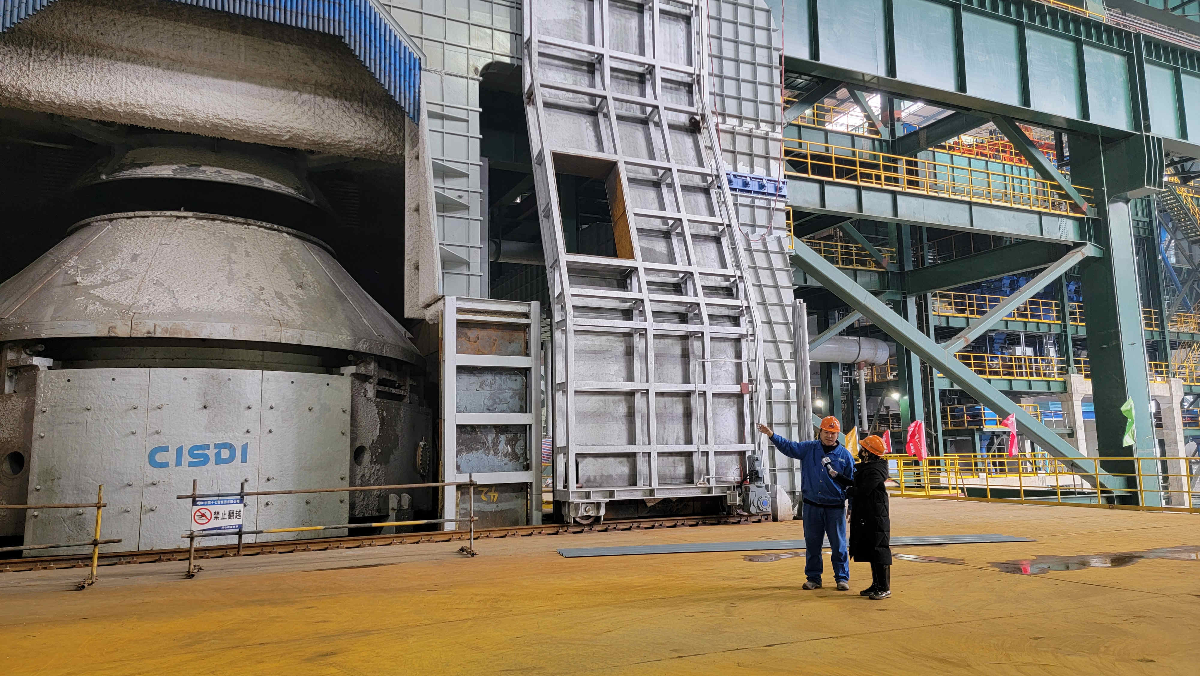 车间顶部有一个巨大的漏斗型设备,像是一个大型“吸尘器”。秦永超介绍,这是车间配备的三套除尘设备之一。顺着秦永超手指的方向望去,在转炉上方,是一次除尘设备。“烟气温度比较高,有一千多度,通过气化冷却系统降至两三百度,静电除尘处理之后,灰尘会落下来,然后再次除尘。通过三次除尘系统,车间内微小的灰尘也会被除尽,所以车间是相当干净的。我们的作业环境也会成为行业标杆。”秦永超骄傲地说。