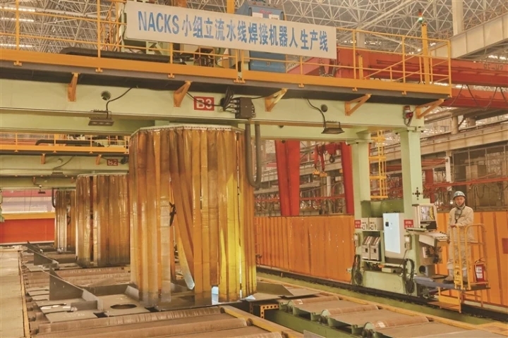 昨天在南通中远海运川崎拍摄的画面。中远海运川崎目前已经建成投产21条智能化生产线,核心智能装备的创新应用走在国内船舶行业前列。近年来,一批船舶海工龙头企业以智能化、数字化实现跨越式发展,助推南通市高技术船舶和海洋工程产业迅猛发展。 记者 许丛军摄