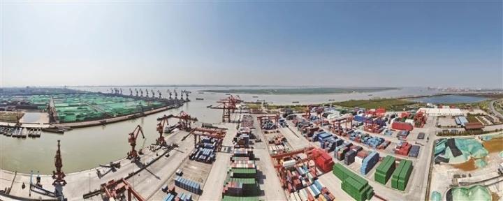 3日在如皋市长江镇拍摄的如皋港苏中国际集装箱码头。一季度如皋港吞吐量2133.77万吨,同比增长4.87%,集装箱吞吐量11.52万标箱,同比增长2.80%。如皋港是国家一类开放口岸上海组合港南通港群的重要组合港,拥有长江中下游地区深水岸线和土地资源,是江苏省沿江开发的重要组成部分,中远海运、马士基等均已进驻,中国制造的产品通过这里运往世界多个国家和地区。 记者 许丛军摄