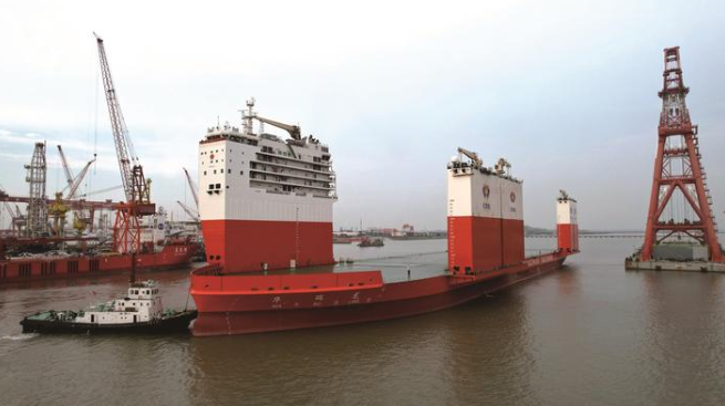 8月27日上午,全球第三大半潜船“华瑞龙”于南通海门正式交付。据悉,该船为8万吨级半潜船,是目前全球第三大半潜船和中国第二大半潜船,也是亚洲第一艘无常规艏楼、四岛式设计的新型半潜打捞工程船。 通讯员杜厚泽 记者吴霄云