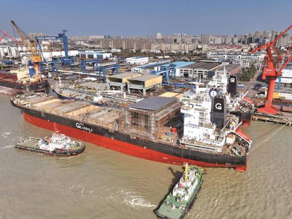 昨天,南通中远海运船务码头,众多船舶正在修理、改装。2022年,南通中远海运船务完成船舶修理改装189艘,比2021年增加20艘。 记者 许丛军摄