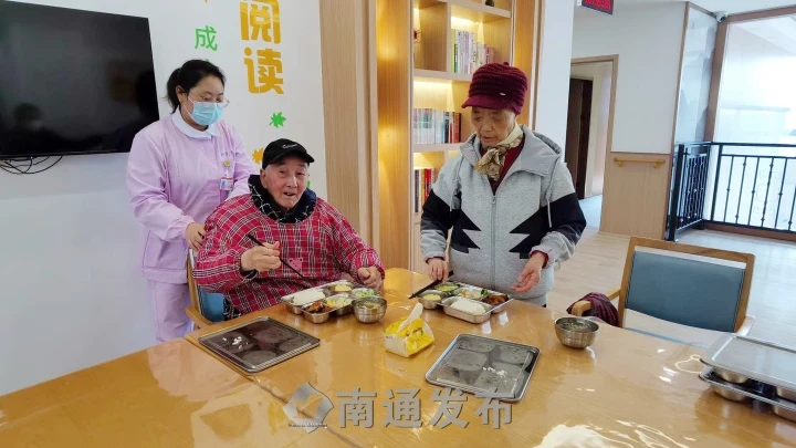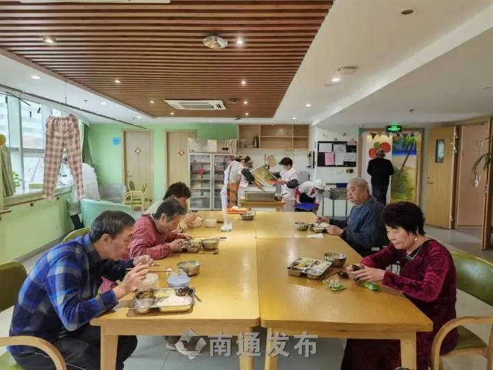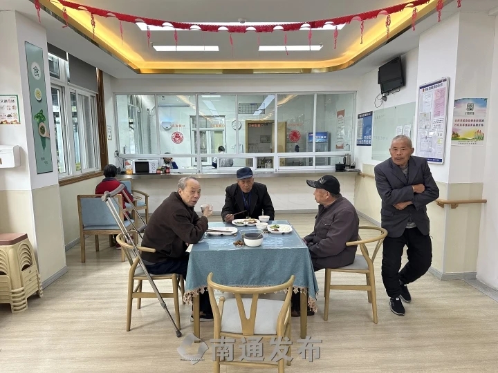 南通开发区中兴街道长者驿站家老人午间就餐。