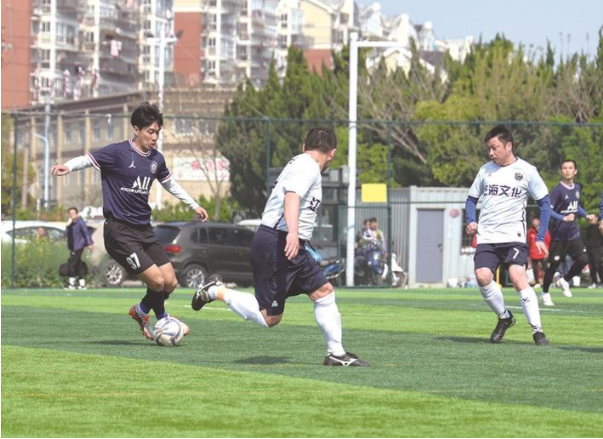 8日,南通江海游击足球俱乐部与江海文化热线足球俱乐部的球员在比赛中。当日,2023年南通市崇川区足球联赛在龙潭足球场开赛。记者徐培钦