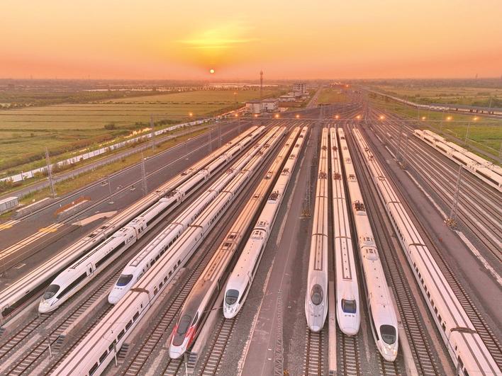 昨天清晨拍摄的南通动车所存车线上准备出发的动车组。据介绍,“五一”南通动车所上线运行动车组创最高纪录,助力长三角铁路运输。据了解,今年五一小长假长三角铁路预计发送旅客2600万人次。 记者许丛军