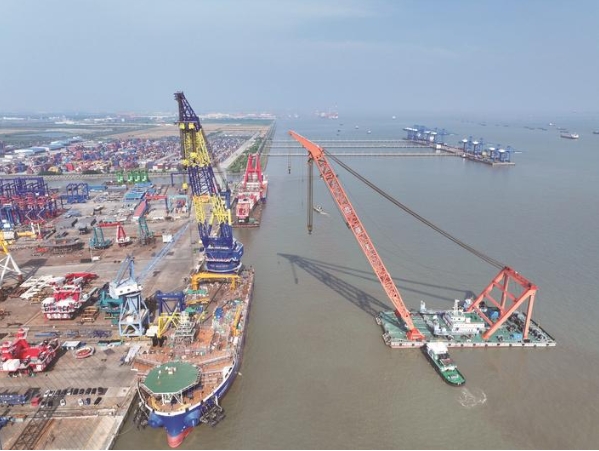 近日,由南通振华重装建造的华夏金租5000吨自航式全回转起重船“华夏鲲鹏01”正在进行为期15天的臂架抬升试验。据悉,该项目从起重机总装到臂架抬升历时35天,刷新了生产新速度。 记者许丛军