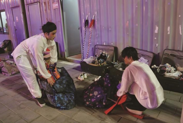 每次演出散场,观众离开,那时夜已深,剧团的工作还没有结束。演员们将脱下的戏服有序地摊放好,因为这些戏服做工精细、造价不菲,随意清洗会磨损刺绣、图案,所以得由服装老师把衣服上沾染的汗水吹干后收纳进箱子。等回剧团后,他们还要对戏服逐一进行消毒、保养。