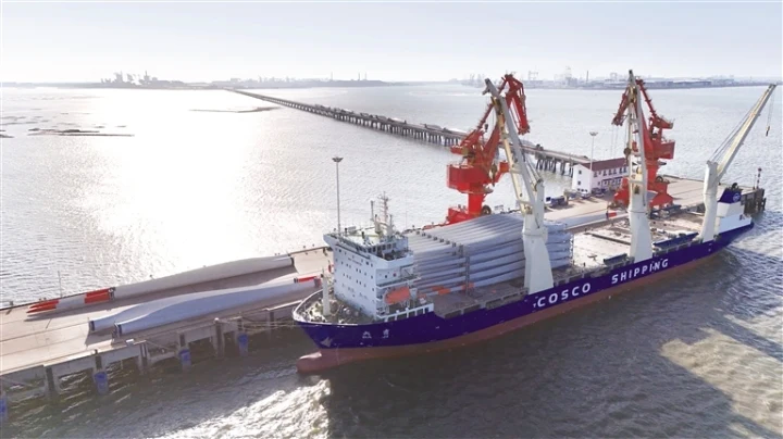 吊机轰鸣、车辆如流……昨日,海门东灶港码头一片繁忙景象。随着最后一片风电叶片在“大吉”轮装载完毕,南通海门港新区今年风电叶片出口总量突破1000片,约117万立方吨,总价值2.15亿美元,同比增长6.2%,营收额5177万元,同比增长7.12%。