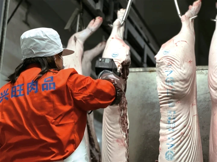 在兴旺肉制品公司屠宰现场,繁琐的传统流程正被信息化和数字化改变。随着生猪被分割,工人们熟练地在猪肉上印上蓝色的证章标识,这些标识如同猪肉的“数字名片”,记录着它们的票证信息和流通信息。