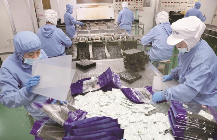 9日,工人在江苏鲜之源水产食品有限公司生产车间加工紫菜。如东条斑紫菜总养殖面积约8万亩,年产值超10亿元。记者 许丛军摄