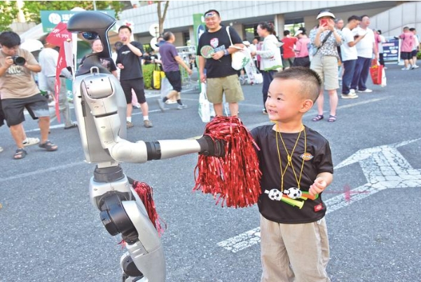 19日,南通足球训练中心如皋基地场外,人形机器人与球迷亲密互动。当天,人形机器人、智能机器狗与球迷互动,点燃全民足球热情。 吴树建摄