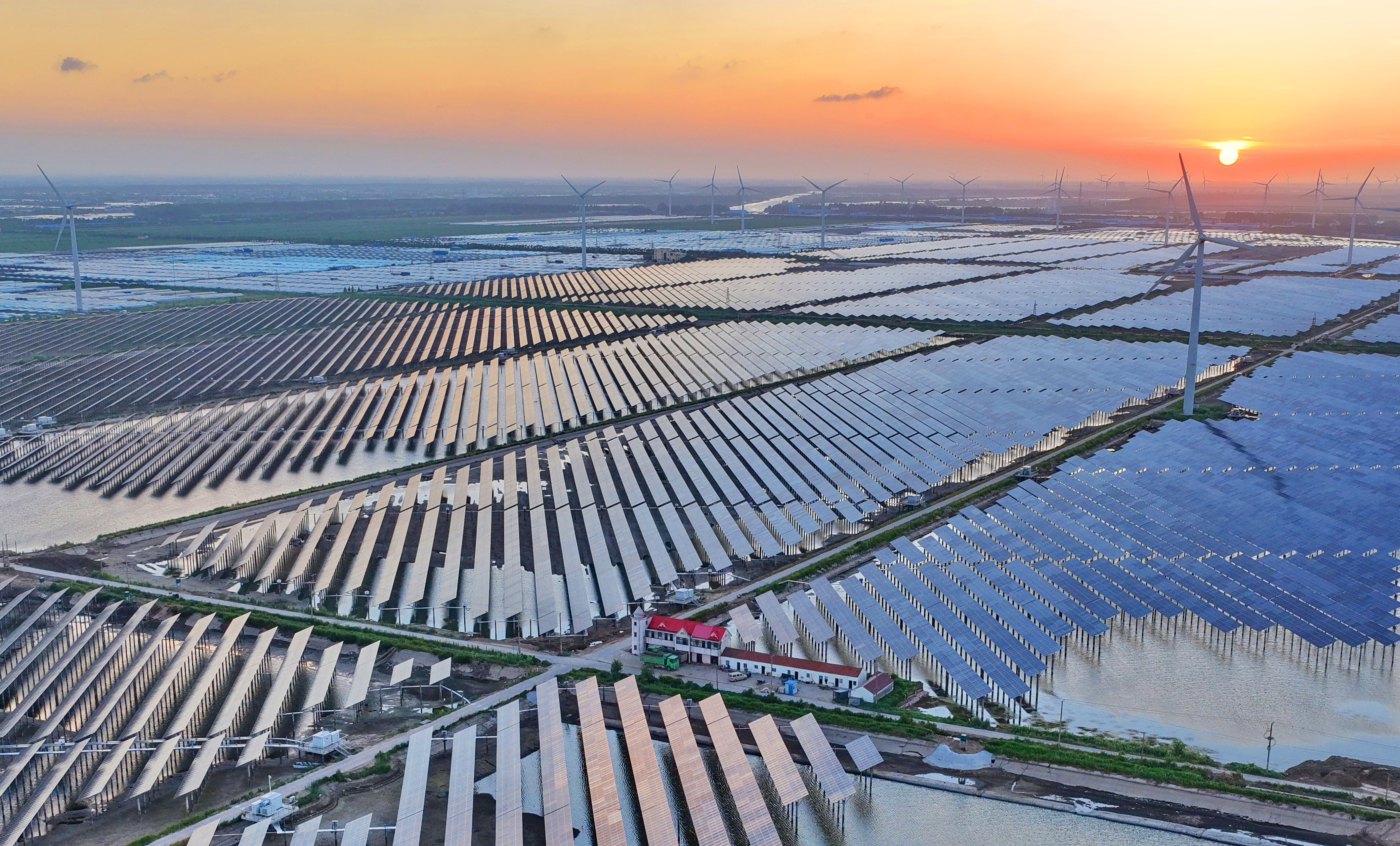 23日拍摄的由中建三局总承包公司承建的南通市最大单体渔光互补光伏项目如东凌洋农场渔光互补光伏发电项目一标段。记者从国网南通供电公司了解到,截止到今年6月末,南通新能源累计发电量突破1000亿千瓦时,达到1085.88亿千瓦时。 记者 许丛军摄