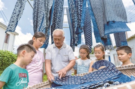 昨天,在通州区二甲镇正兴染坊,国家级非遗——南通蓝印花布印染技艺传承人王振兴向孩子们介绍蓝印花布的制作技艺。暑假期间,二甲镇新时代文明实践站组织小学生们开展蓝印花布体验活动,让孩子们近距离感受传统技艺魅力,传承非遗文化。 翟慧勇摄