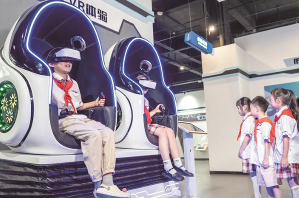 昨天,海安市南屏小学的学生们在海安科技馆里体验沉浸式VR设备。今年9月是首个法定全国科普月,海安市南屏小学组织学生来到科技馆参观体验,让学生们提高科学兴趣,感受科技魅力。 翟慧勇摄