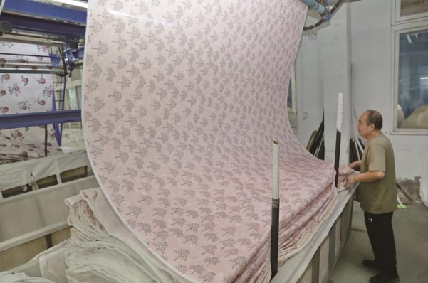 9日,工人在江苏州际数码印花有限公司车间忙碌。该企业通过设备更新升级,新上“数码印花巨无霸”,实现上百种套色,印出的花型几乎可以达到裸眼3D的效果,目前企业日印花布达38万米。 记者 许丛军摄