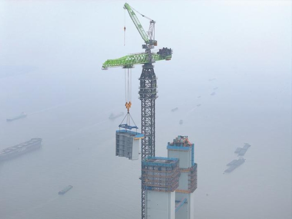 昨天,张靖皋长江大桥南航道桥南主塔进行第26个节段施工,主塔升至300米的新高度。张靖皋长江大桥连接苏州张家港、泰州靖江和南通如皋三市,跨江段全长约7.9公里,大桥预计2028年完工。 记者 许丛军摄