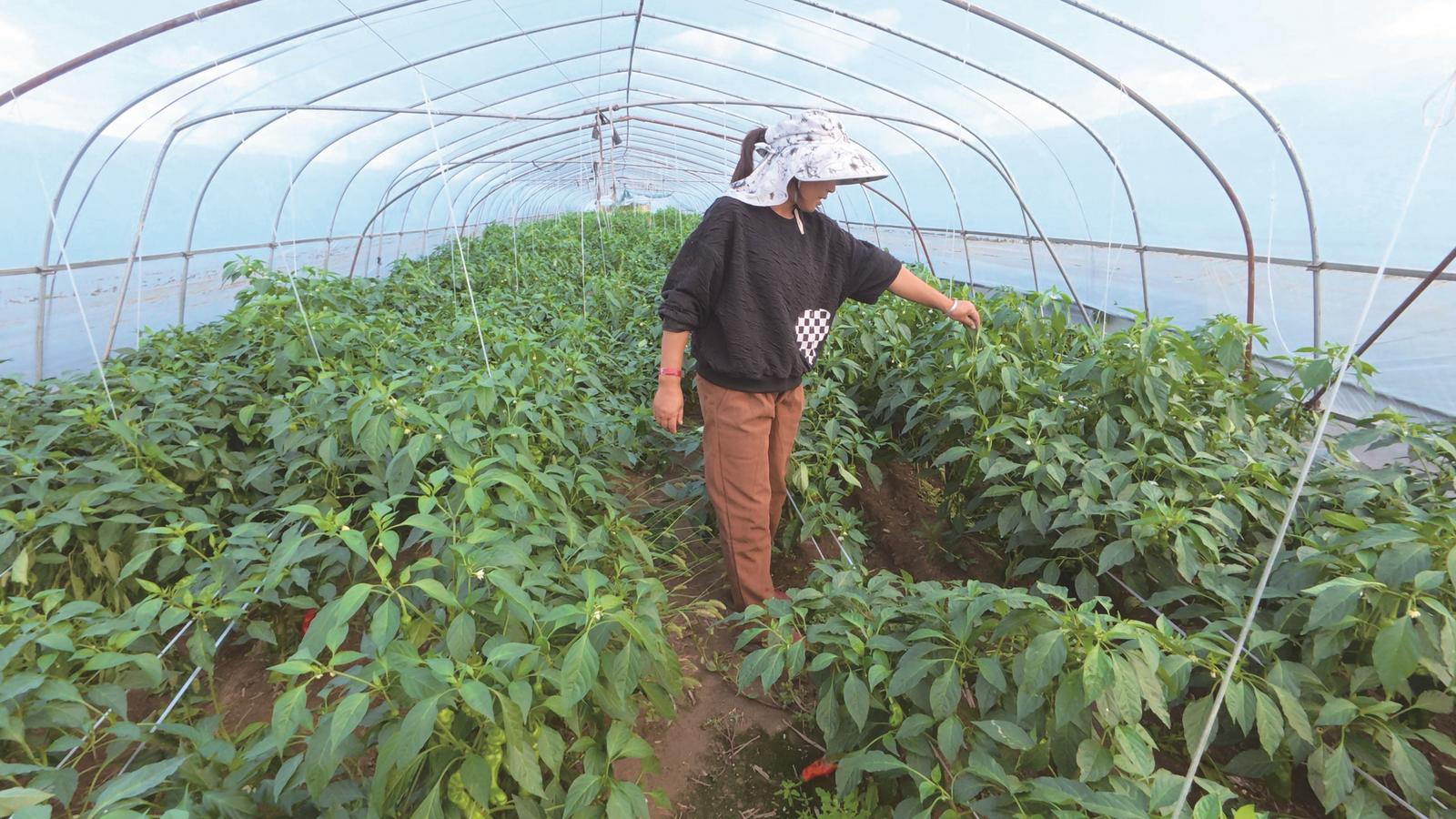 如此好的收成,离不开夫妻俩的精心管理。秦步荣指着棚顶的遮阳网和四周的薄膜介绍,夏天搭网降温,天冷覆膜保温,棚内挖设的排水沟搭配滴灌系统,既省水又能精准控湿。她随手扯了扯固定植株的绑线:“每棵都绑在支架上防倒伏,老家带来的成熟技术,配上这儿现成的大棚设施,管理起来省心不少。”