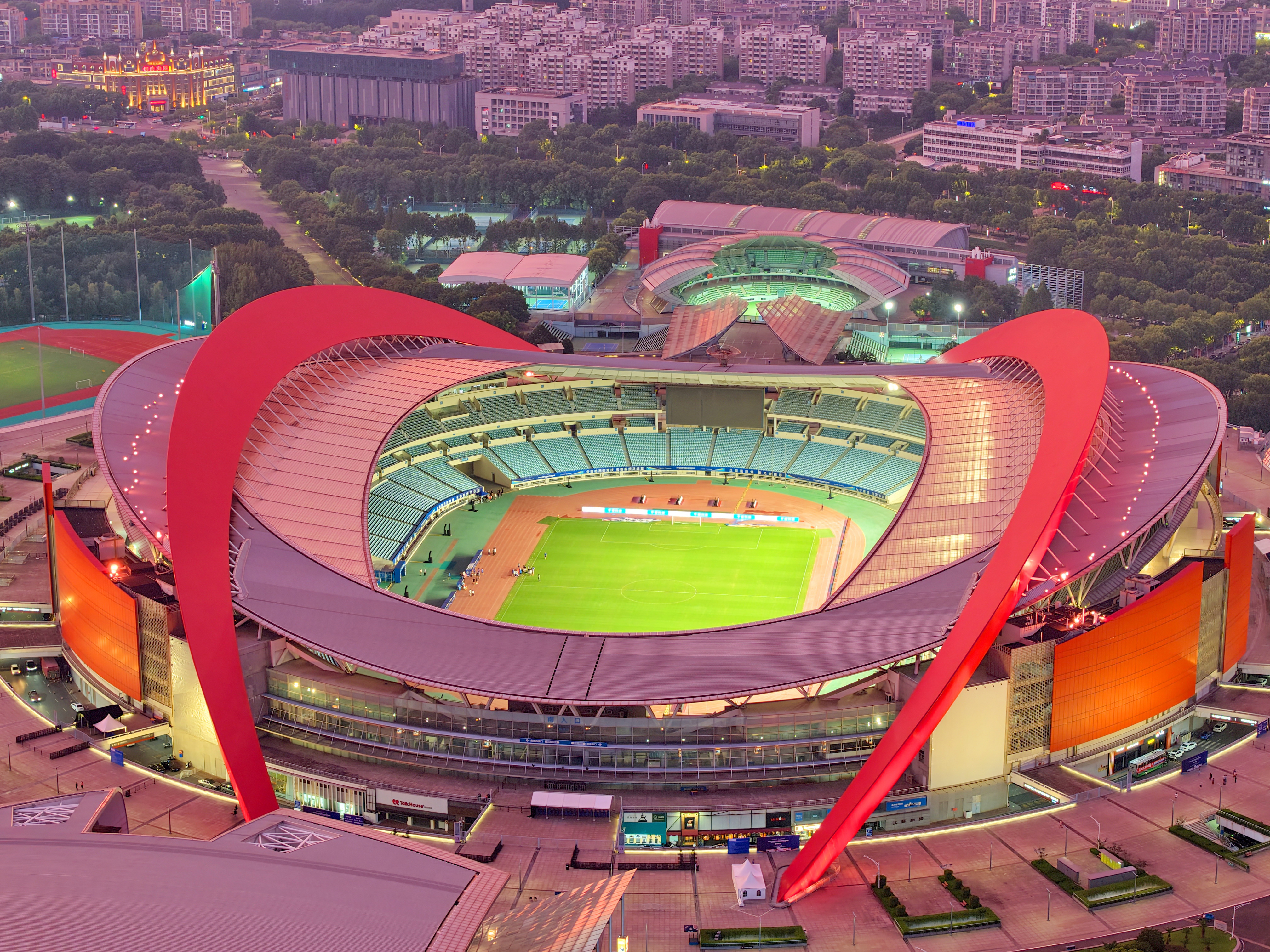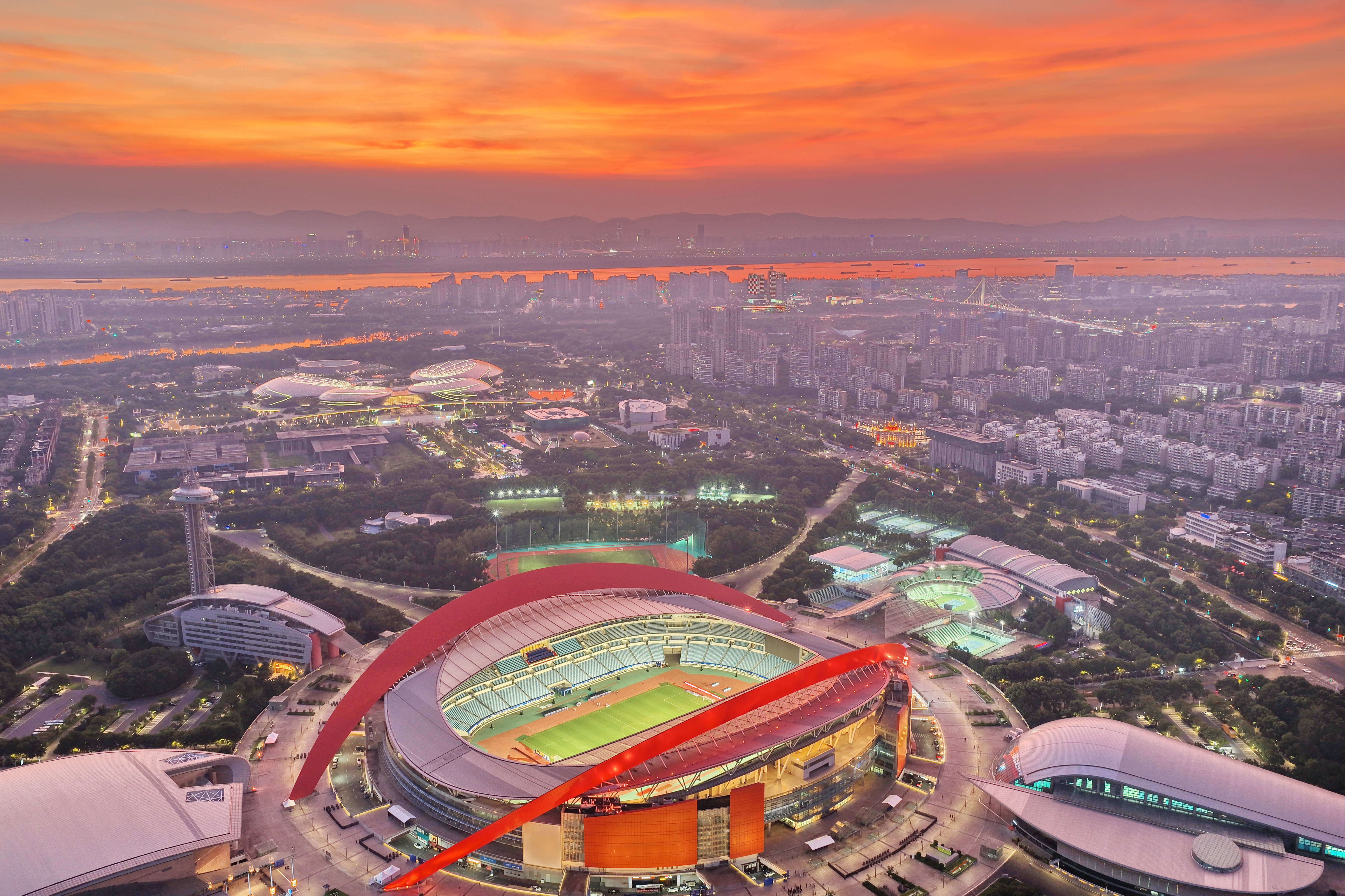 以下照片摄于2025年7月,航拍南京奥体中心美丽夜色。