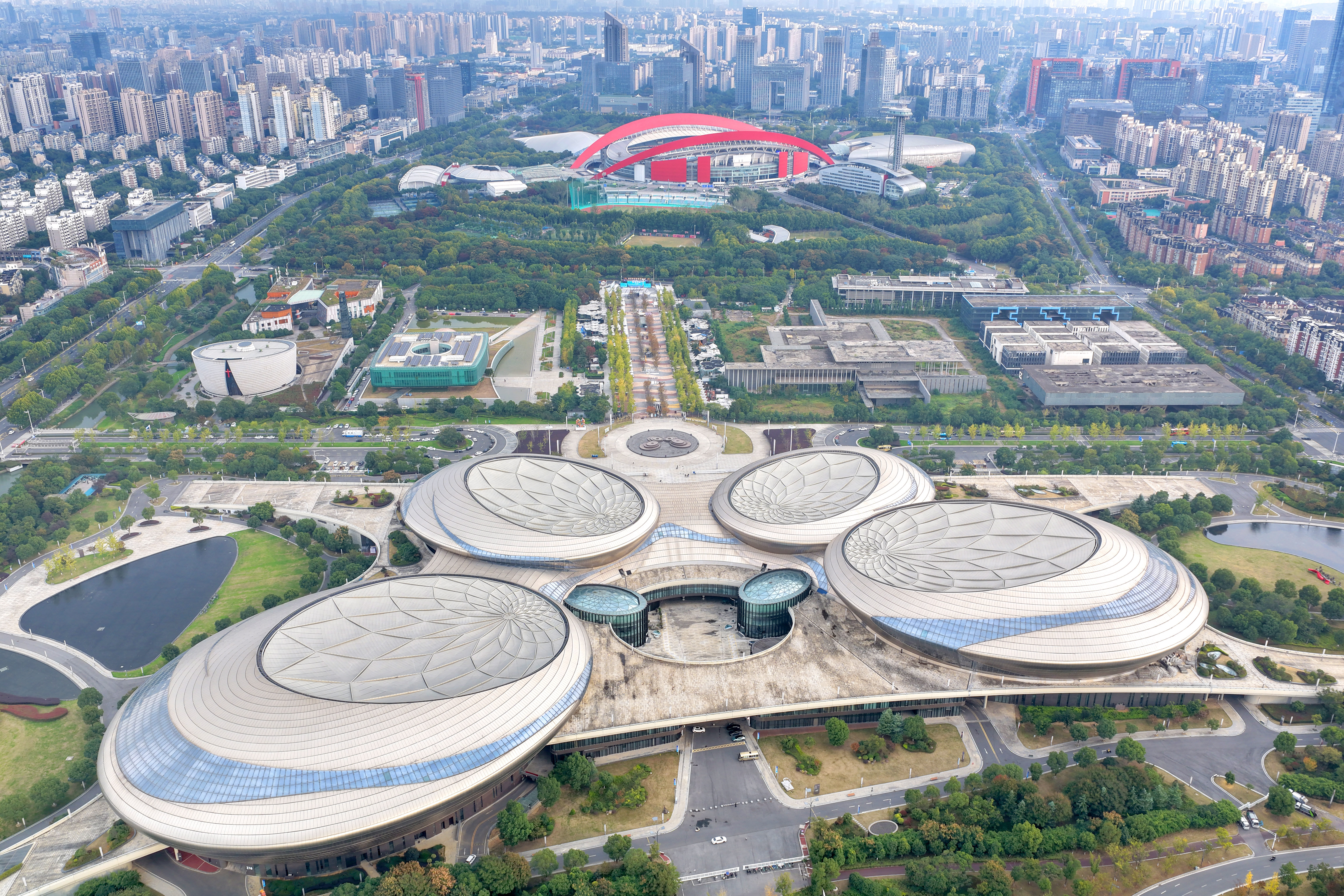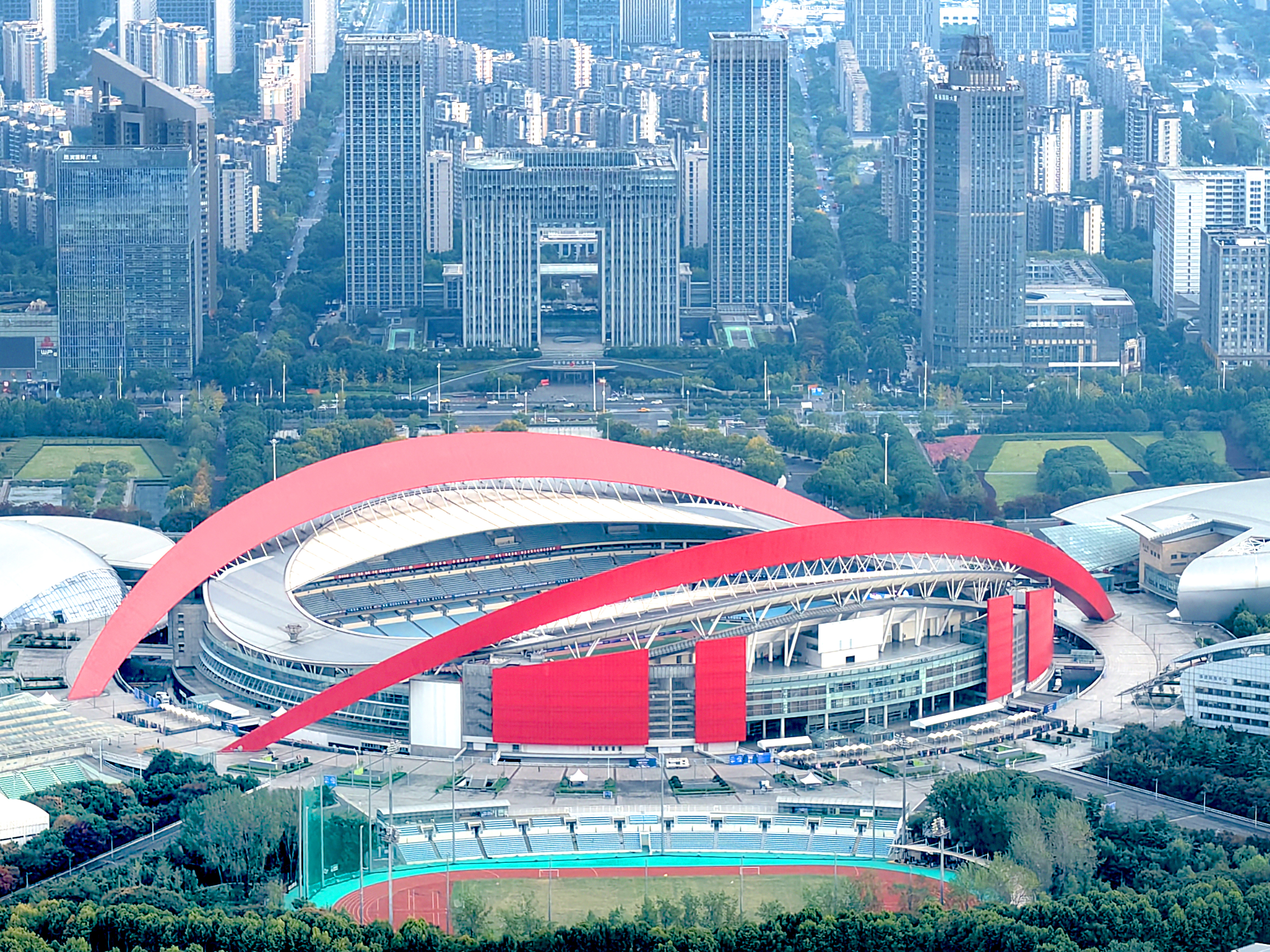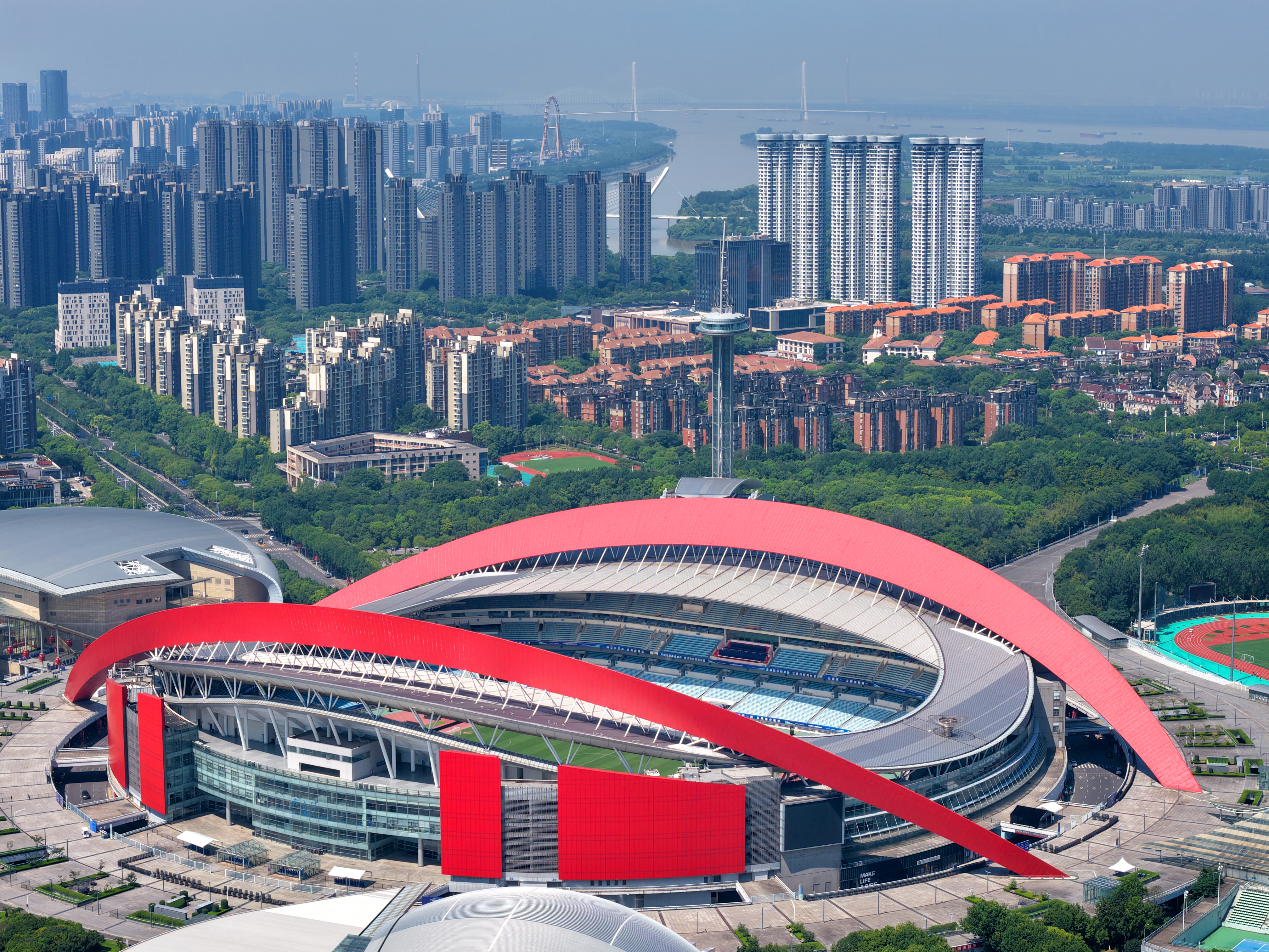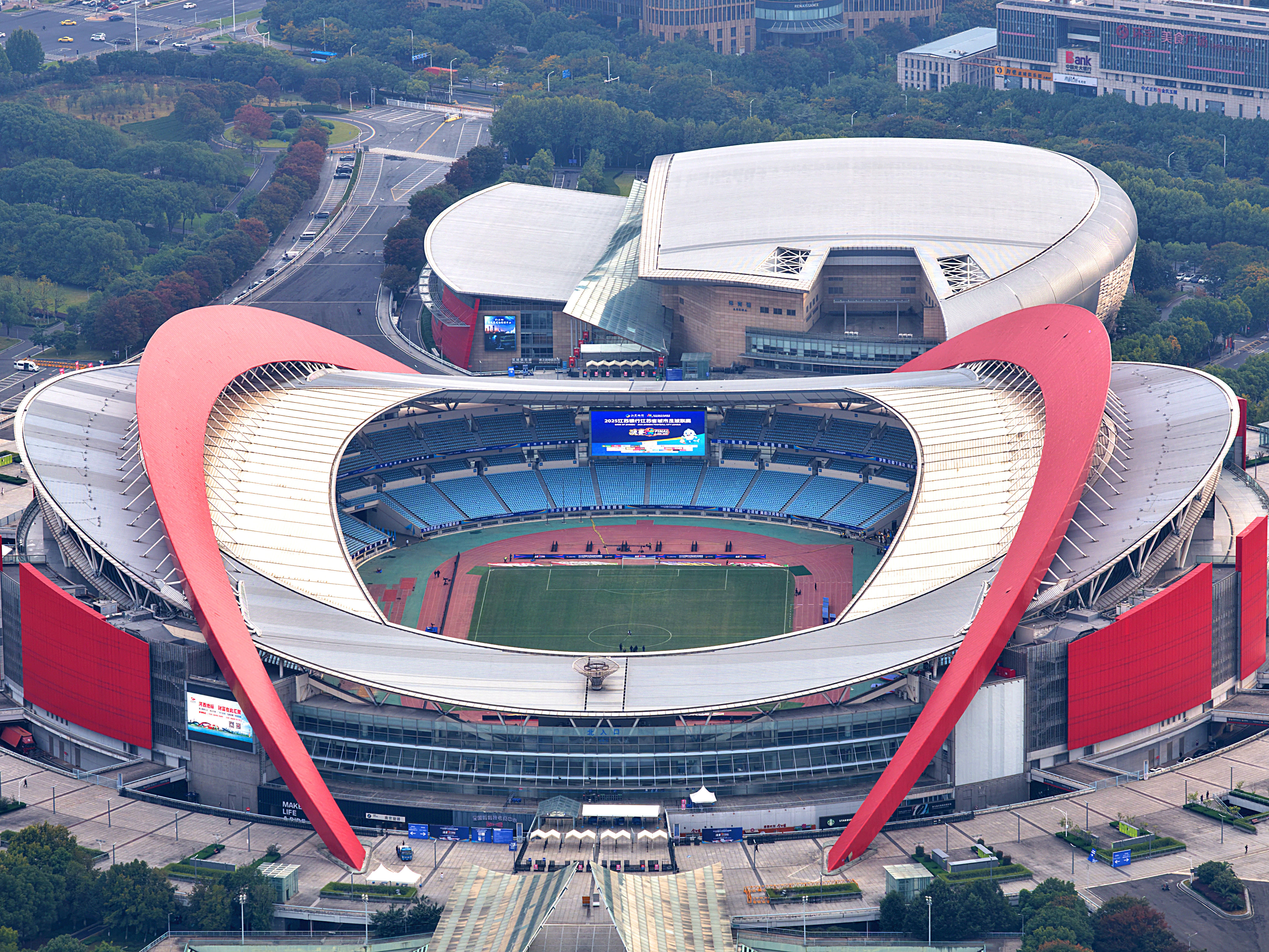 2025年10月31日,记者航拍江苏省城市足球联赛(苏超)决赛举办地南京奥体中心。11月1日晚,南京奥体中心将迎来万众瞩目的2025年江苏省城市足球联赛决赛“南通VS泰州”赛事。