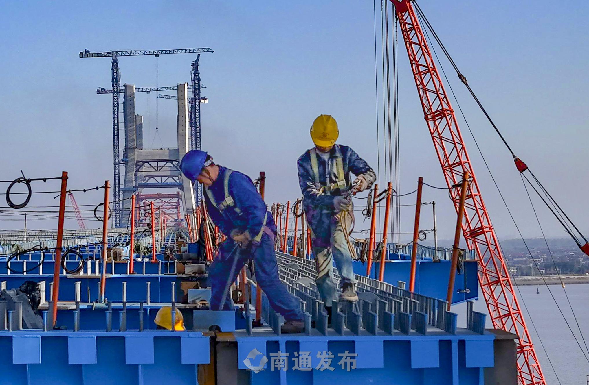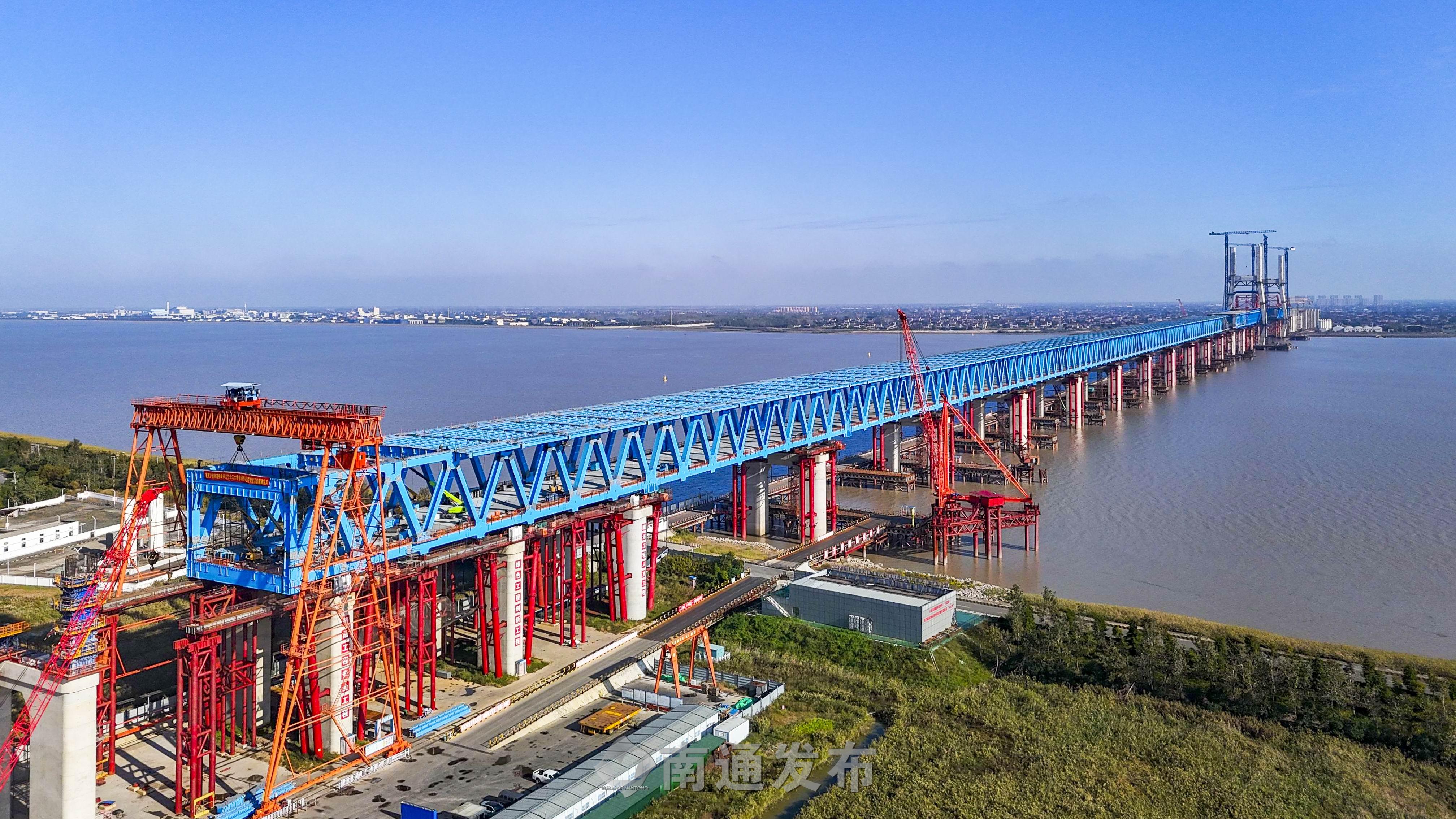 现场负责人张晓波介绍,此次吊装组拼完成的是非通航孔最后一根公路横梁。钢桁梁由工厂制造,水路运输至桥位处码头,去年6月6日开始在大桥南岸钢梁预拼场吊装组拼。非通航孔桥钢梁公路横梁吊装组拼全部完成为最后一轮顶推和后续与主通航孔钢梁“会合”以及公路桥面板安装等施工创造了有利条件。