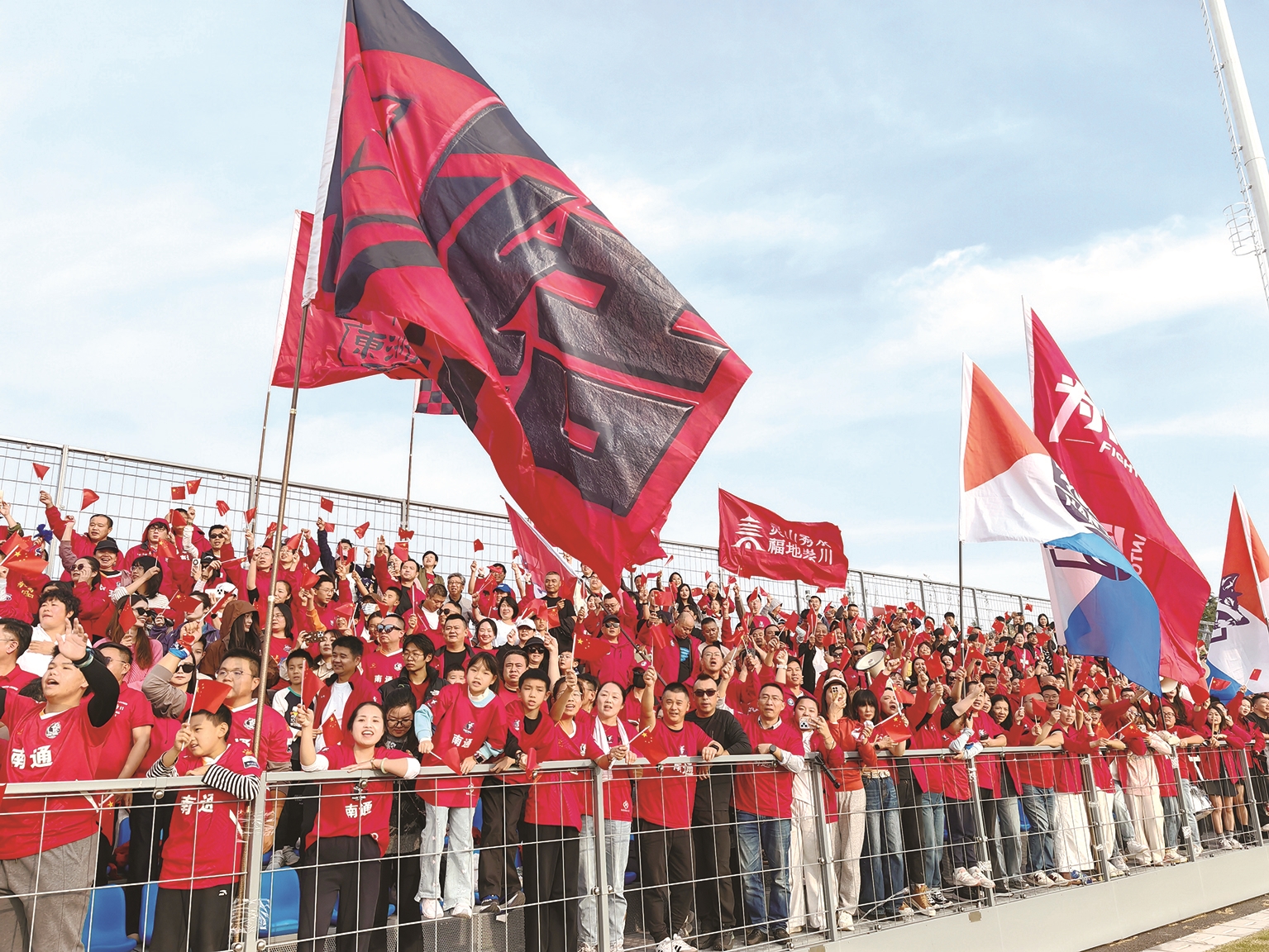 下午3点15分,南通长江体育公园早已化身一片红色的海洋。彩旗飘扬、人声鼎沸,3000多名球迷翘首以盼,迎接属于南通的城市英雄。