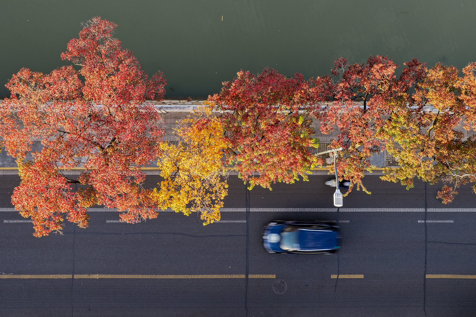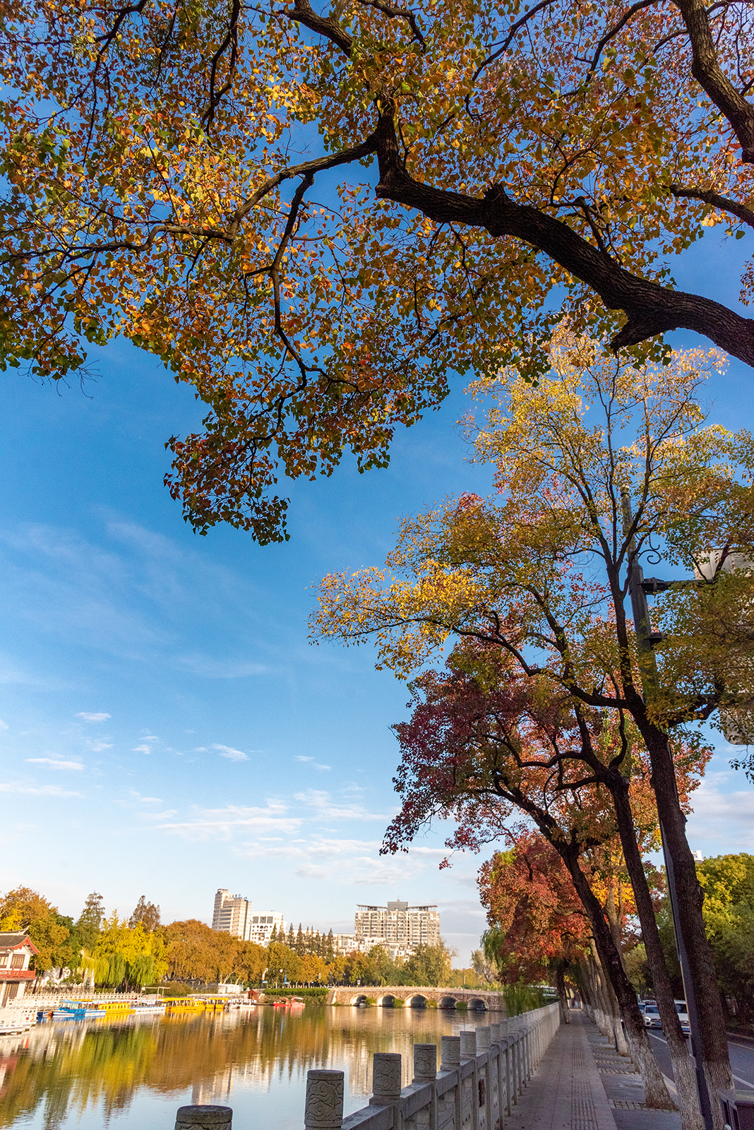 一字排开的乌桕树,已然褪去夏日的青翠,换上绚丽多彩的秋装。叶片色彩层次极为丰富,有的炽烈如火,鲜艳夺目;有的呈现出明亮的橙黄,温暖人心;有的则介于红黄之间,呈现出迷人的绛紫。阳光透过疏朗的枝条,洒在五彩斑斓的叶片上,更显通透灵动。一阵微风吹过,彩叶翩跹而下,与波光粼粼的河水相映成趣,构成一幅动人的城市生态画卷。