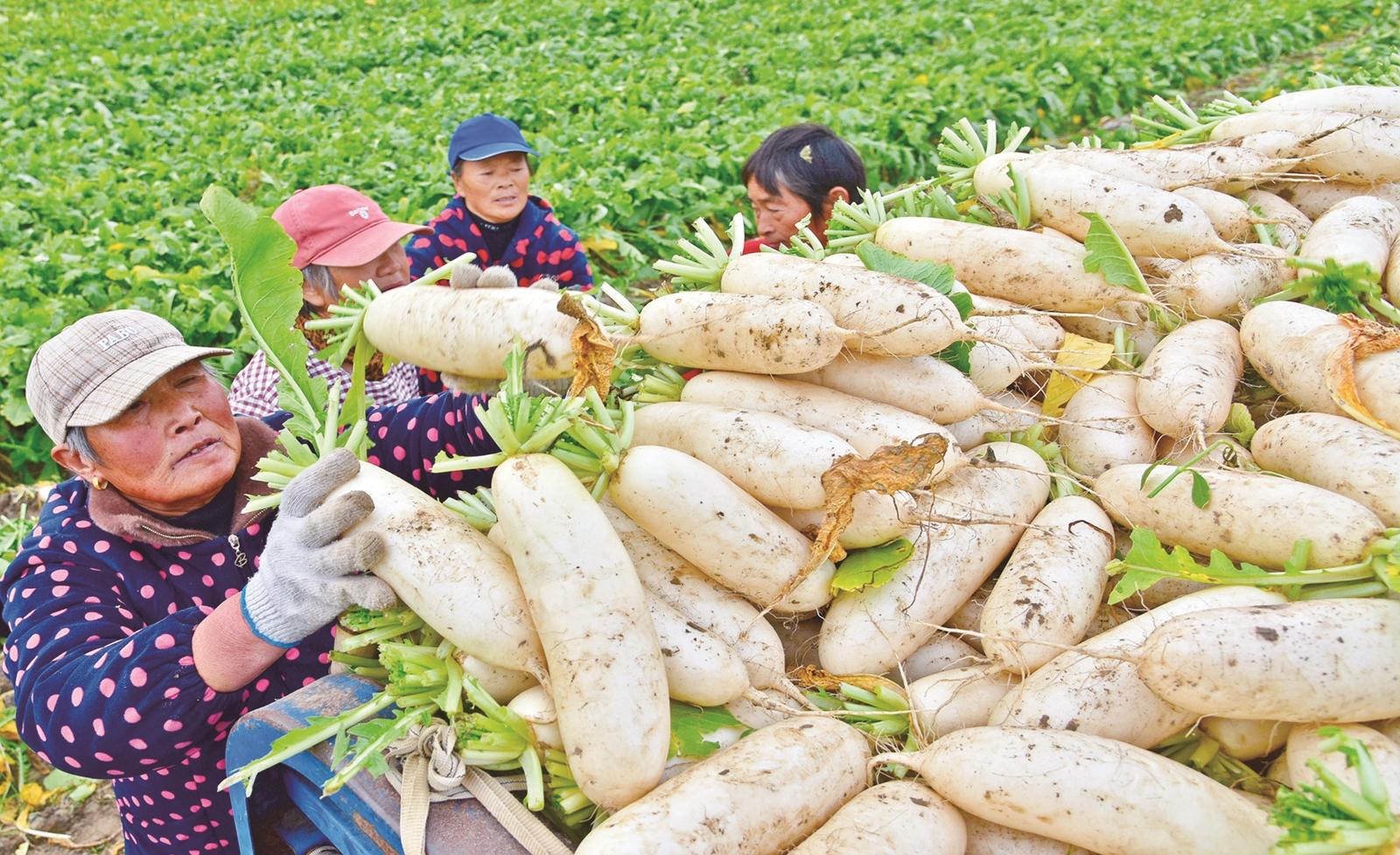 昨天,如皋市长江镇谢楼村白萝卜种植基地的250亩绿色无公害白萝卜迎来收获期,当地农民忙着采收、清洗、分拣、打包“订单白萝卜”,准备运往浙江、上海、南京等大中城市商超,丰富群众初冬“菜篮子”。 吴树建 薛冯摄