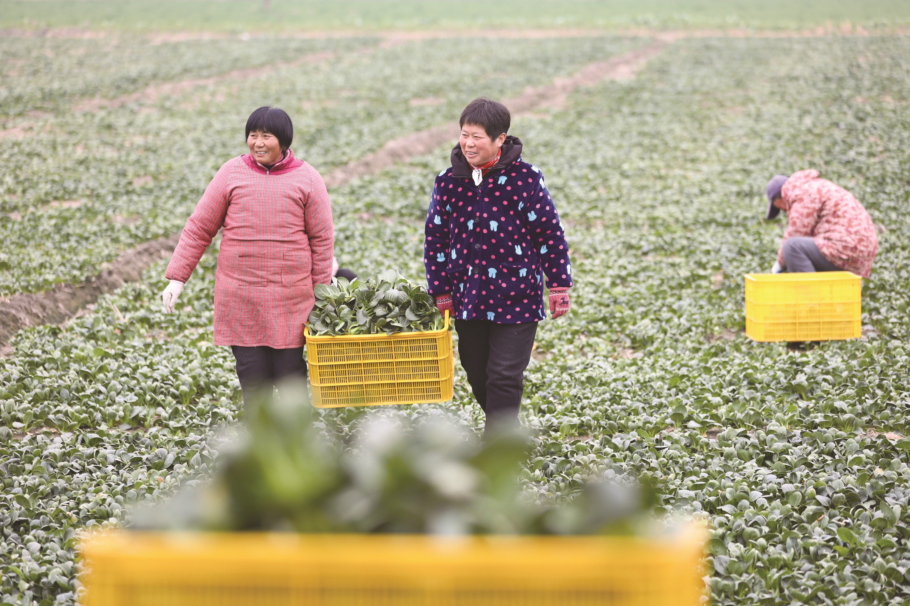4日,海安市雅周镇惠琴家庭农场,菜农正抢收田间青菜。为保障市场供应不受天气影响,农场正加紧采收、分拣与调运,确保雪天前后市民“菜篮子”量足价稳。 顾彬斌摄