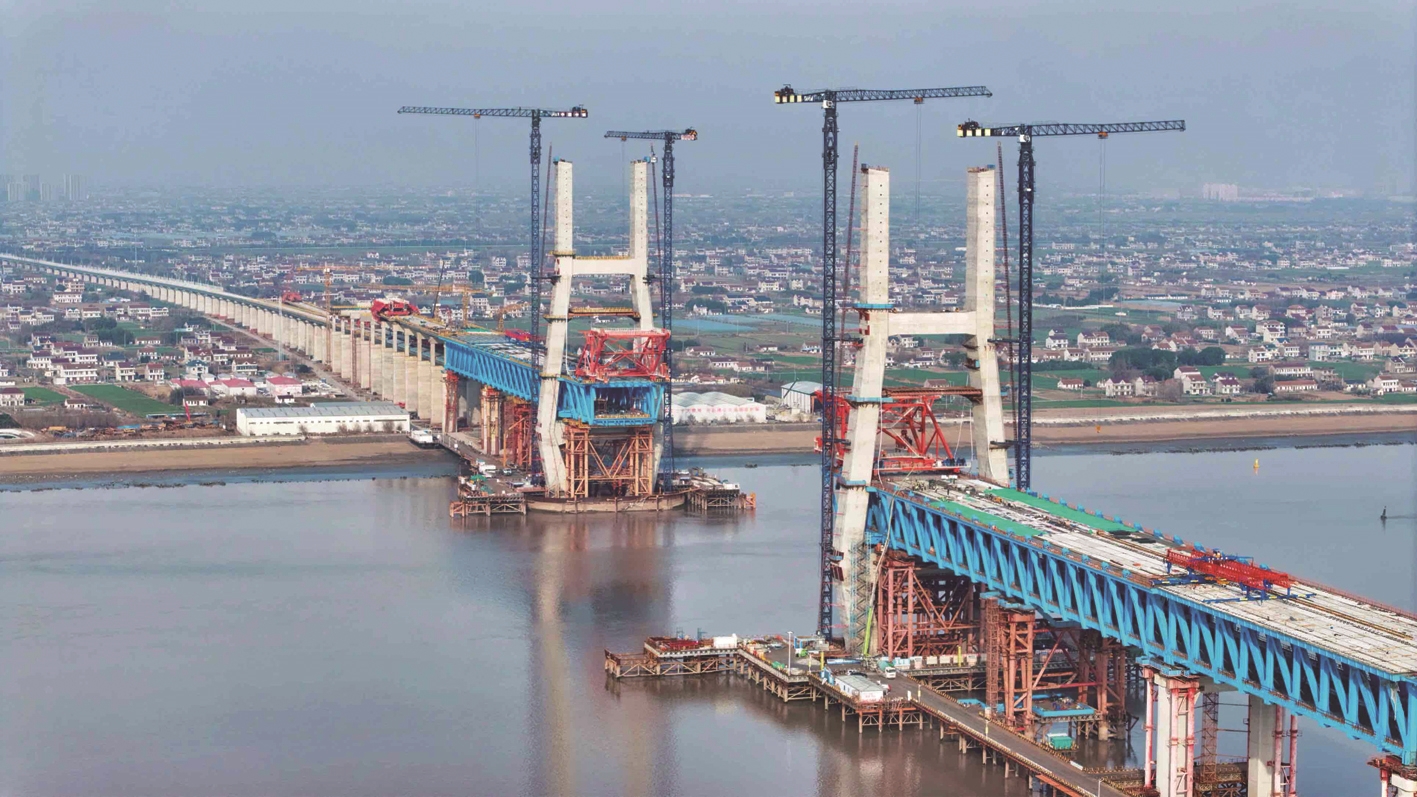 崇启公铁长江大桥是北沿江高铁控制性工程,全长4.09公里,主跨达400米,采用双层公铁两用设计,上层为双向六车道公路,下层为时速350公里高铁和时速250公里城际铁路,是目前在建的世界最大跨度公铁两用无砟轨道斜拉桥,也是长江上设计时速最高的公铁两用过江通道。全桥共设112根斜拉索,单根最大长度203米,最大索重约33.4吨。