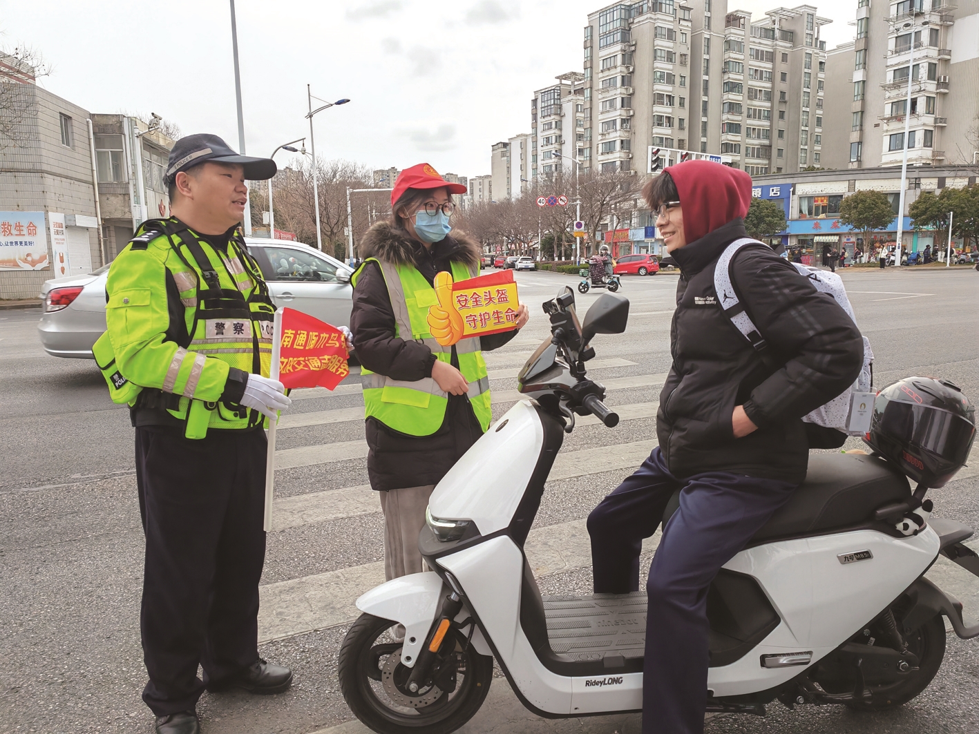 春运首日,来自南京医科大学公共卫生学院的大一学生林秋彤,作为志愿者参与了文明交通劝导服务。她说,这样的“寒假实践”非常有意义,让自己对交通出行安全的重要性有了直观的感受、理性的思考,在志愿活动过程中,她及时提醒电动自行车骑乘人员按交通法规佩戴好安全头盔,当看到市民们面带微笑、报以真诚的感谢时,自己作为一名参与交通安全服务的大学生也感受到了作为志愿者的幸福与价值。