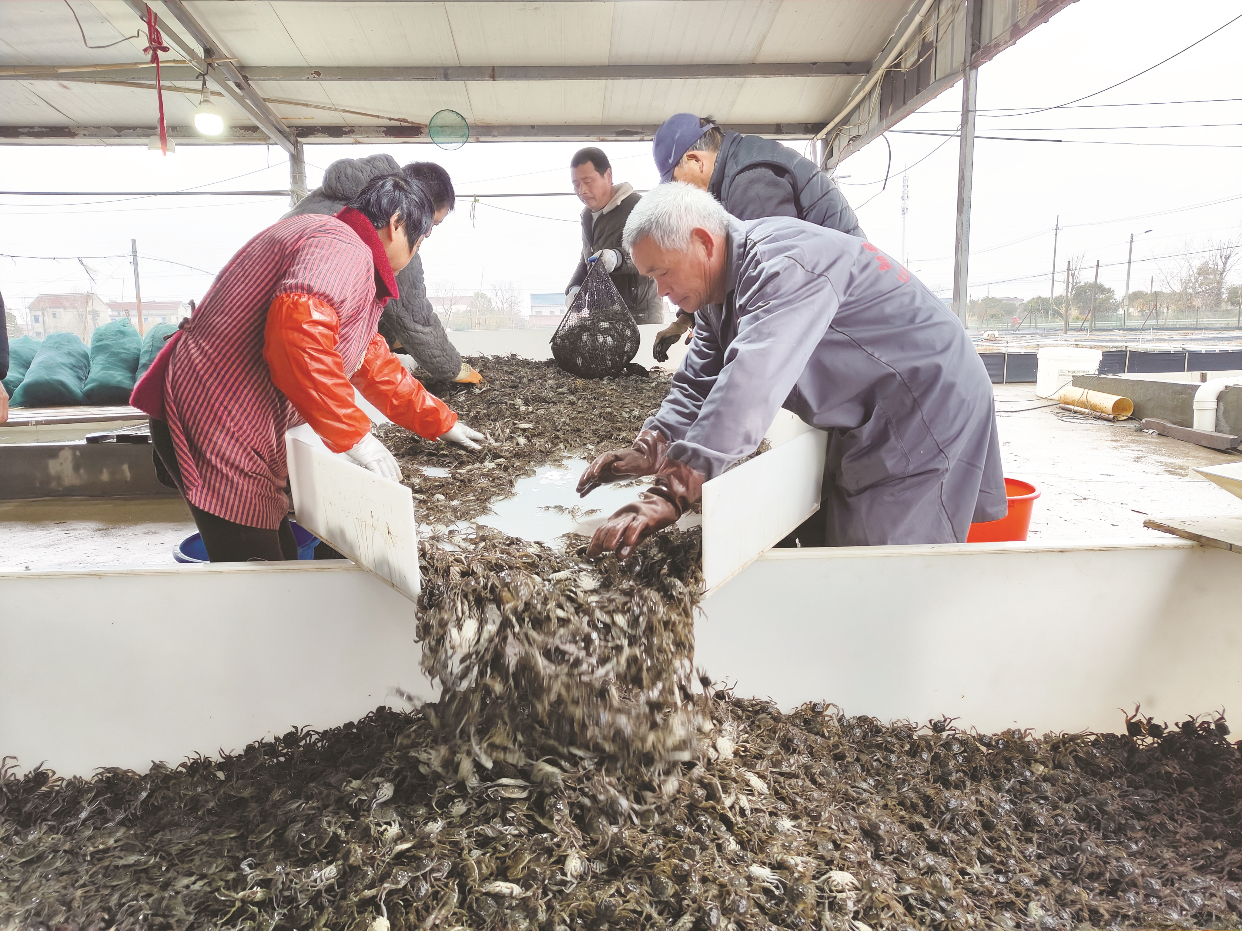正月初六上午,节日气氛尚浓,启东惠萍镇公和村扣蟹培育基地内,穿着连鞋雨裤的62岁农场主张倪生满身泥浆,正在指挥工人分工协作,他们或塘中“捉”蟹、或集中清洗、或分拣公母、或去杂包装、或称重装车,一派“蟹进蟹出”的繁忙景象。