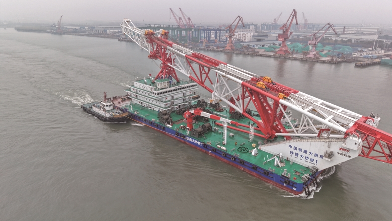 3月16日,在海巡艇现场维护及4艘大马力拖轮的协助下,全球最高打桩船“铁建大桥桩1”轮顺利离泊江苏大津重工有限公司南通基地码头,前往东海试航区开展试航作业。这艘总长130.5米、船宽40.8米的“巨无霸”,是目前世界上桩架高度最高、吊桩能力最大、作业水深最深的打桩船。