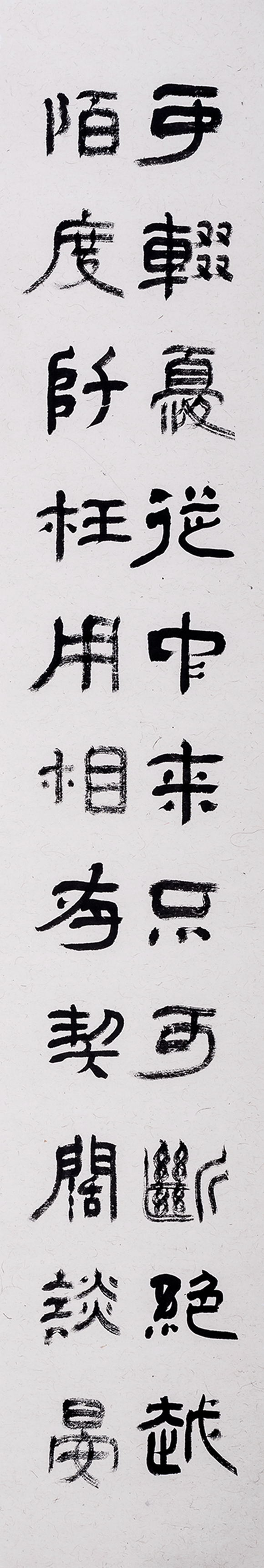 二、出新意。艺术家都注重自家面貌,贵明老师书法艺术的个人面貌尤为突出。篆书、隶书、草书均能不拘泥于传统技艺,如大篆和隶书变字形巧拙为工整,专注于线条的厚重质感和篆隶结体的融合,极富现代装饰意味。草书则大气磅礴,生动奇趣。用孙过庭的话讲就是有“奔雷坠石之奇,鸾舞蛇惊之态,绝岸颓峰之势”,“非自然之妙有,非力运之能成”,是下了苦功夫的。真正达到“智巧兼优、心手双畅”的境界。贵明先生潜心书法研究和实践,教学相长,致力于追求独特的艺术风格,记得早年有一段时间,特别推崇扬州八怪中的金冬心、郑板桥等人,对他们的艺术风格形成颇有研究,在长期的实践探索后终于能“出新意于法度之中,寄妙理于豪放之外”,在当今书坛是殊为难得的。